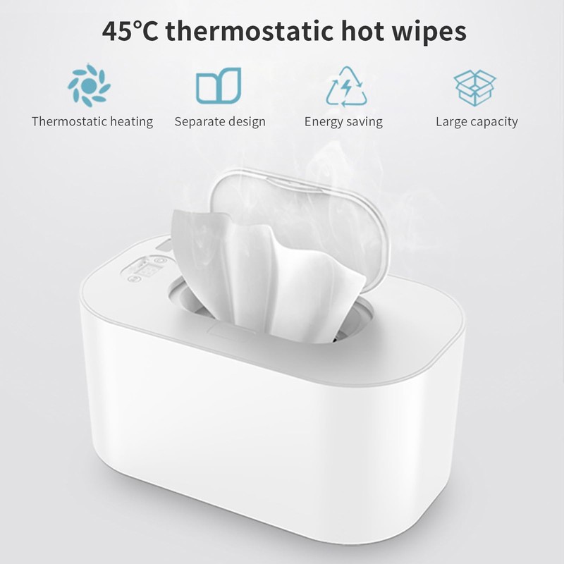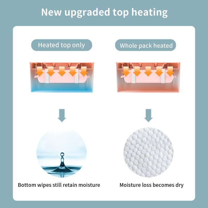 - Top Heating: The top is heated and ready to use, the bottom low temperature to keep fresh. The top heating plate is designed to quickly heat the top 4‑5 wipes from top to bottom to keep the bottom wipes fresh and avoid drying out due to long term heating.