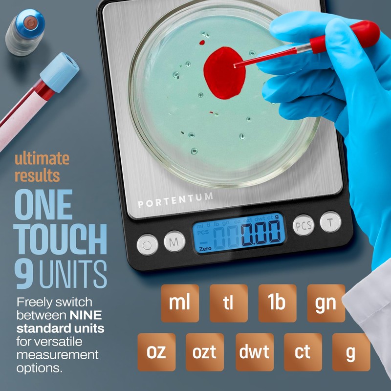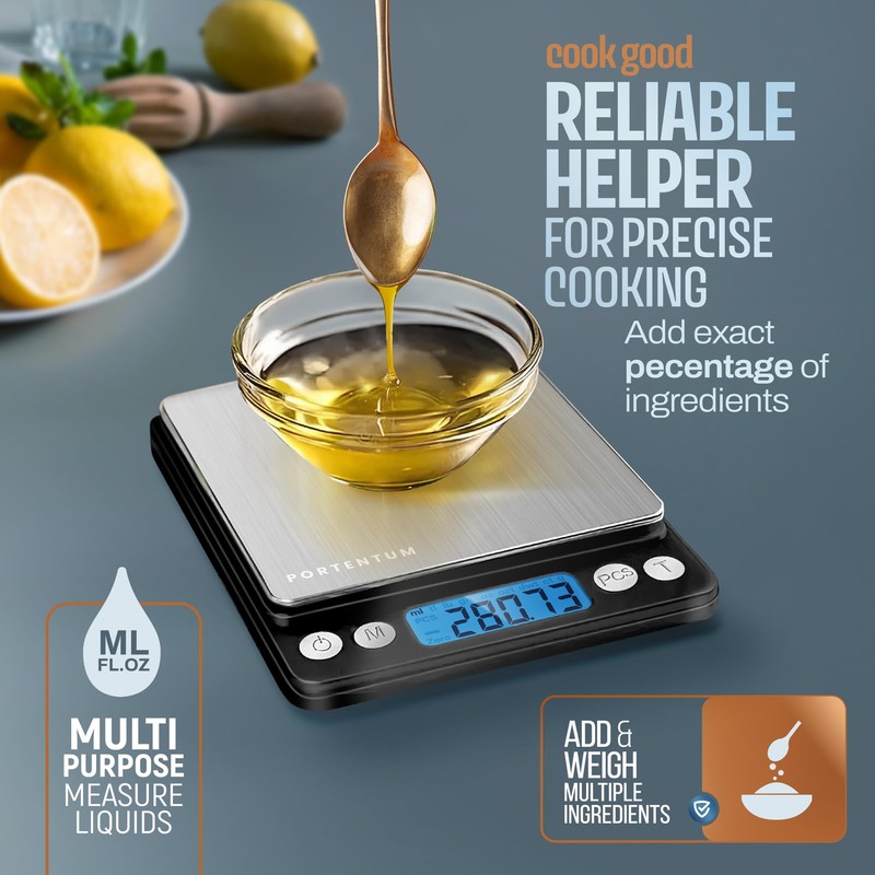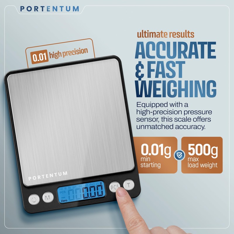 PORTENTUM Digital Kitchen Scale 500g/0.01g - Food or Mail, Electronic, Stainless Steel, Measuring Function for Liquid in ml and fl. oz., Precision Scale