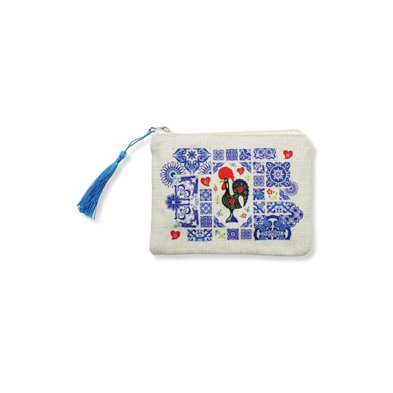 Portuguese Burlap Pouch with Barcelos Rooster & Azulejo Tile Design with Blue Tassel