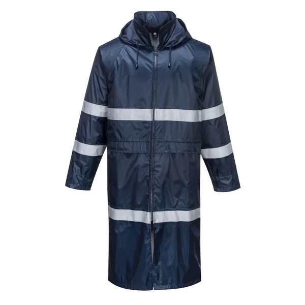 Portwest F438 Men's Waterproof Raincoat - Reflective Long Rain Jacket with Hood and Pockets Navy, Medium