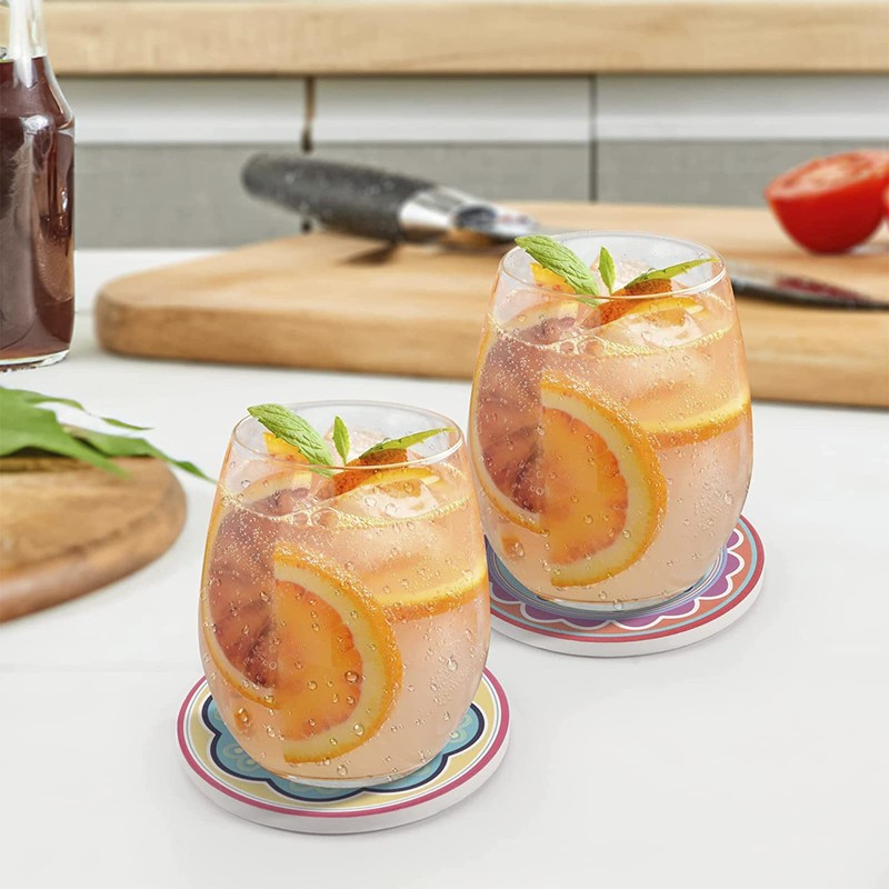 - ◕‿-ღ【FÁCIL DE LIMPIAR】: posavasos de 10,2 cm de diámetro, apto para todas las copas, tazones y tazas. Más conveniente de limpiar que otros posavasos, solo enjuáguelo con agua.Se recomienda que si los líquidos más oscuros como el café o el vino manchan el posavasos, enjuague inmediatamente con agua y jabón para reducir cualquier decoloración o manchas permanentes al patrón del diseño del posavasos.