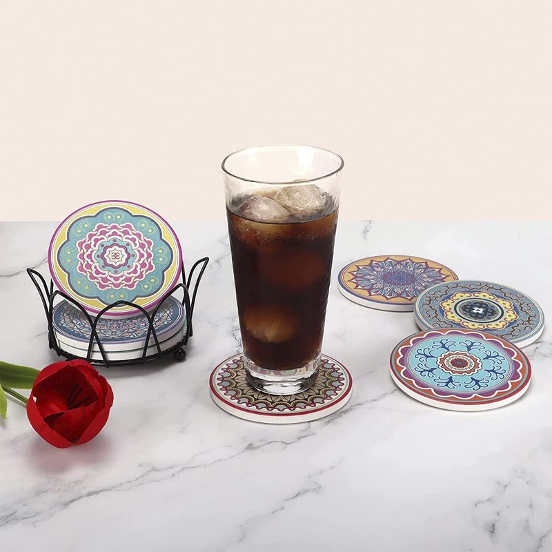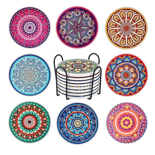 - ◕‿-ღ【JUEGO COMPLETO】: Este juego de posavasos incluye 8 posavasos de piedra cerámica en diferentes estilos de mandala Y un posavasos de hierro negro. El soporte para posavasos almacenará tus posavasos y ahorrará espacio.Y hay dos estilos para elegir, y los patrones son muy ricos.
