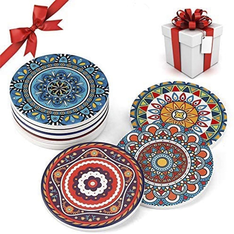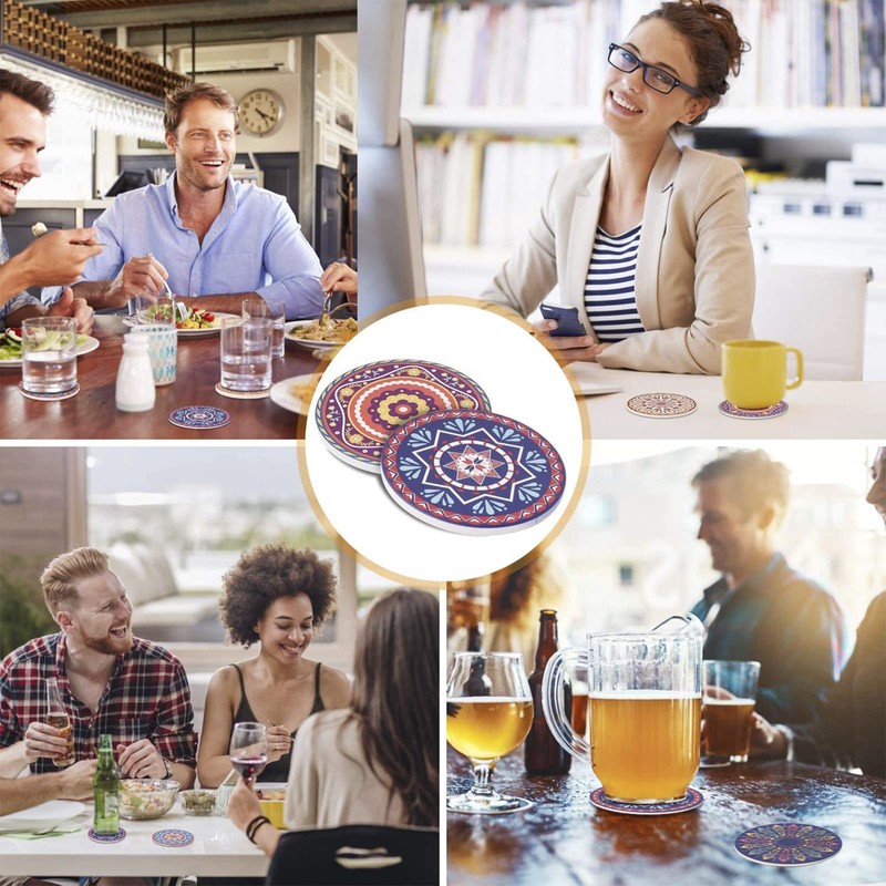 - ◕‿-ღ【CERÁMICA ABSORBENTE】: La capa superior de los posavasos está hecha de cerámica absorbente, que absorbe mejor que los posavasos de silicona para mantener la mesa seca.la superficie de los posavasos absorbe todo tipo de manchas o anillos de agua en un segundo; son superabsorbentes de agua, protegiendo inmediatamente tus muebles de derrames o marcas de agua.Los posavasos de piedra de cerámica son coloridos utilizando diseños decorativos que se mezclan con la decoración de tu hogar.