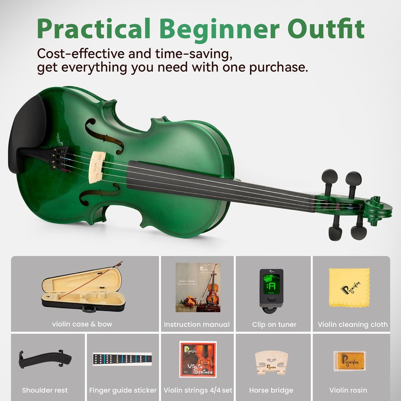 Poseidon Violin for Beginner, Full Size Violin Set for Kids Student with Hard Case, Extra 4/4 Strings Set, Violin Bow, Horse Bridges, Rosin, Shoulder Rest, Clip-on Tuner, Manual - Green Glossy Antique