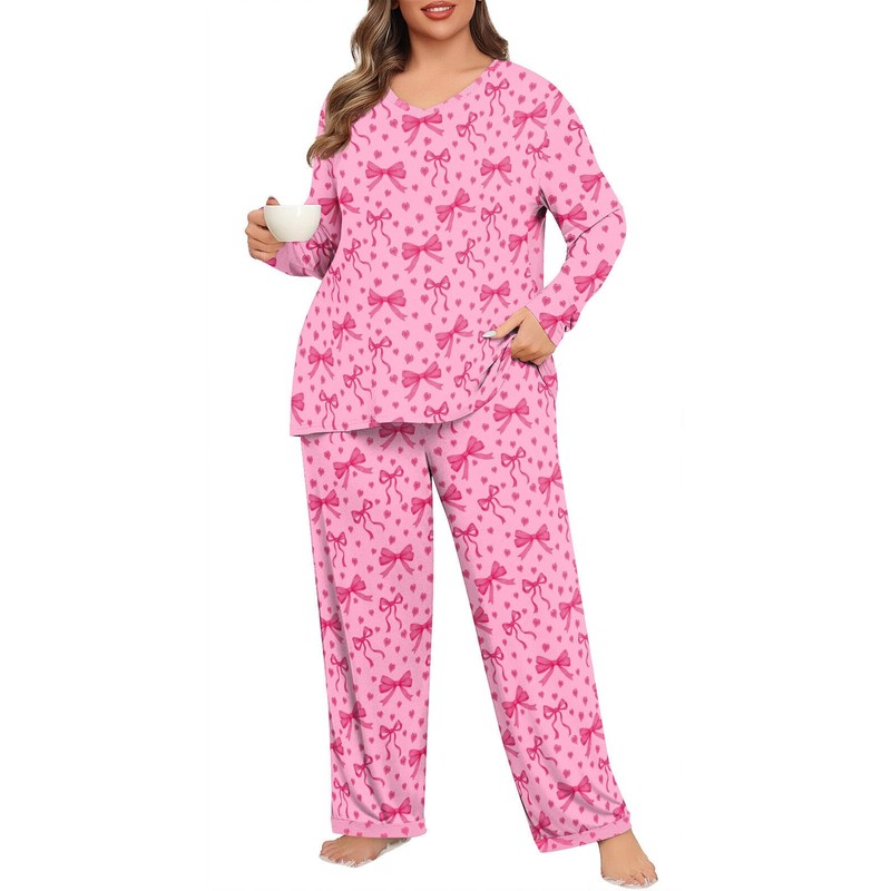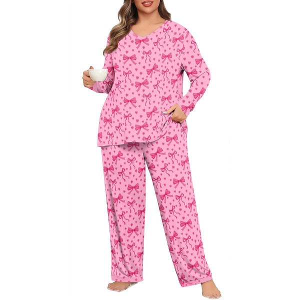 POSESHE Women’s Plus Size Pjs Two Piece Fall Pajama Sets Plus Size Soft Cute V Neck Lounge Nightwear,Pink Bow,3XL