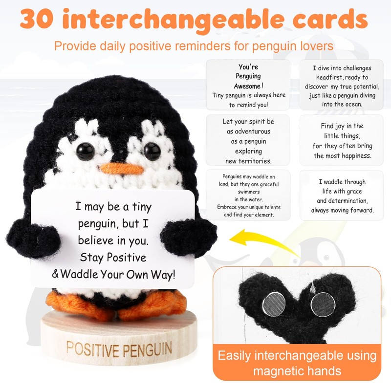 Positive Penguin, Soft Magnetic Crochet Penguin with Wooden Base and 30pcs Cards Knitted Animals Ideal Emotional Plush Support Gifts and Table Decor for Birthday Anniversary Xmas