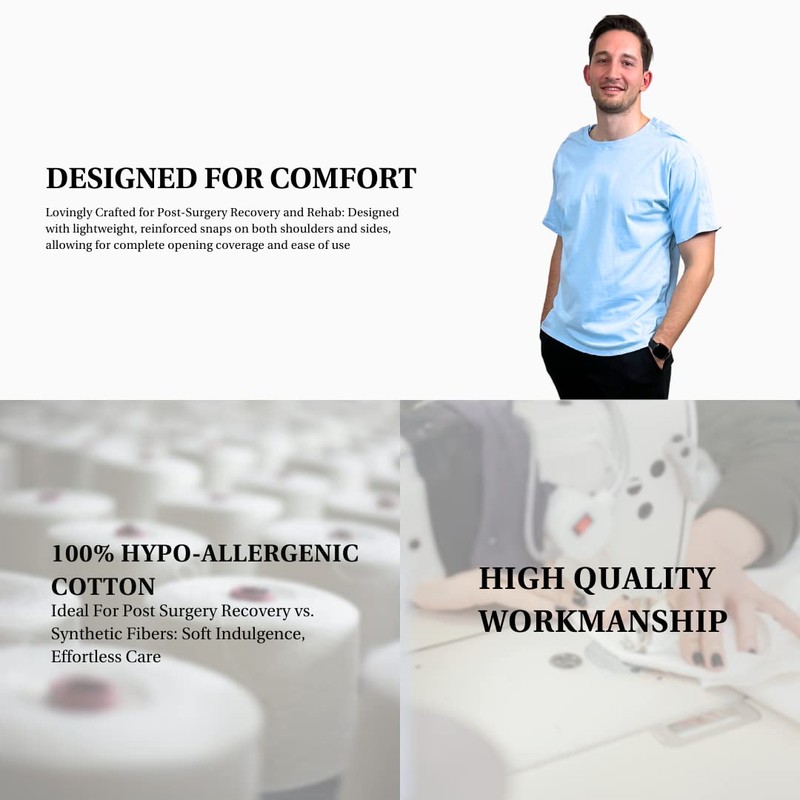 Classic Crew Neck T Style Adapted for Your Comfort, Style and Privacy. Look Great and Feel Awesome as You Work on Your Recovery While Avoiding Bulky, Uncomfortable Clothing and Patient Gowns.