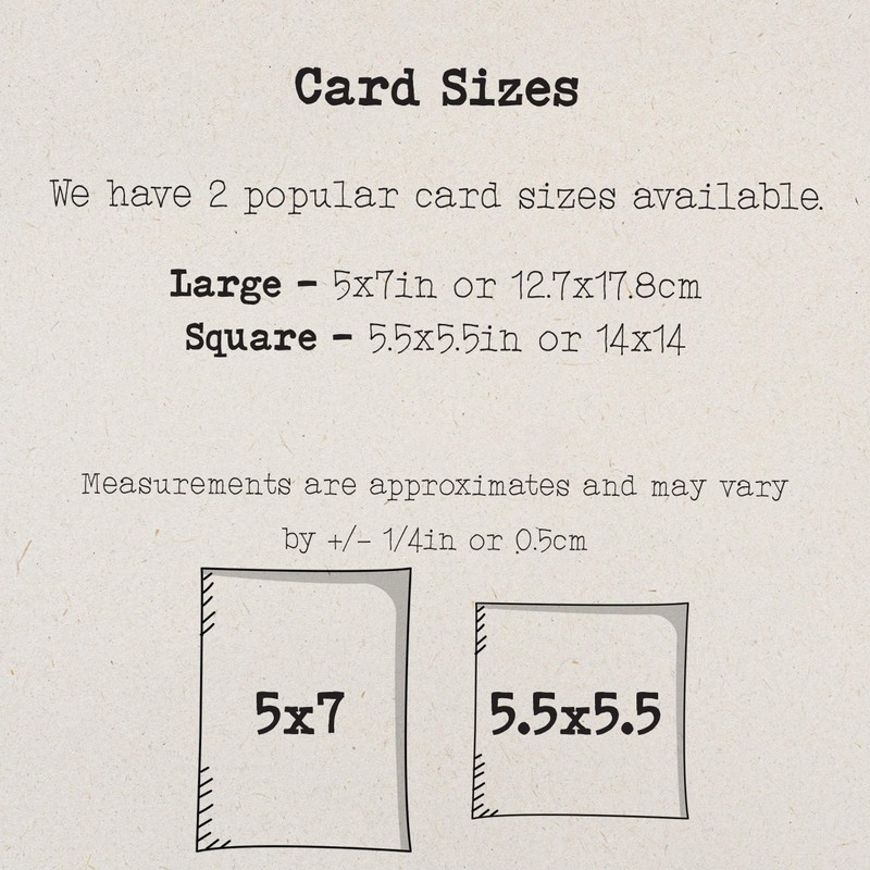 - Size and measurements: Our cards are 5x7 Inches or 12.7x17.8cm are printed on 100% Recycled 300gsm Card / Matte Finish and come with an envelope, All cards are blank inside, leaving plenty of room for your personal and sentimental messages.