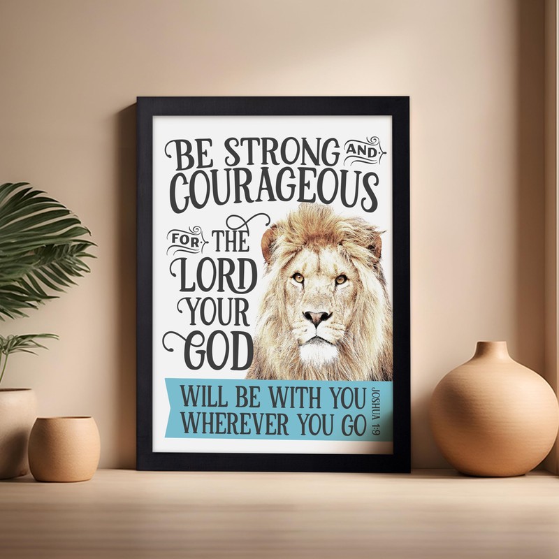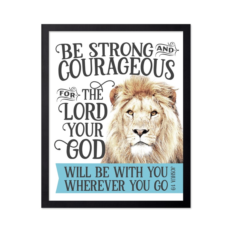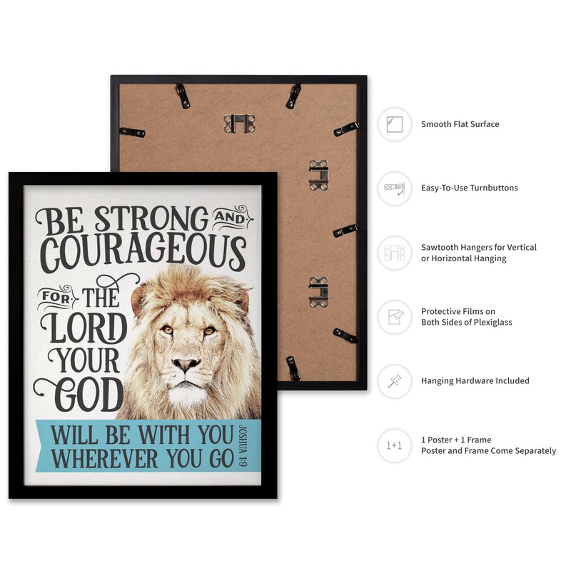 Poster Master Motivational Poster - Christian Print - Gift for Religious, Friend - Be Strong and Courageous, Lion, God, Joshua, Bible Verse - Wall Decor for Home, Office, 16x20 Black Framed