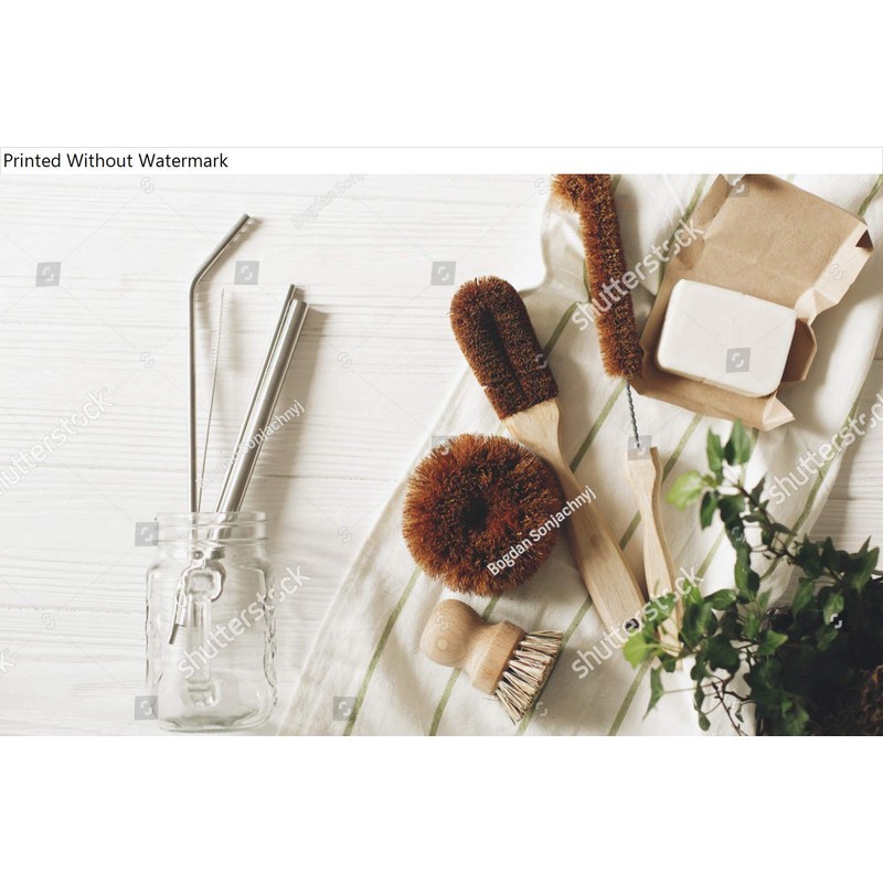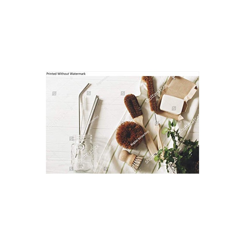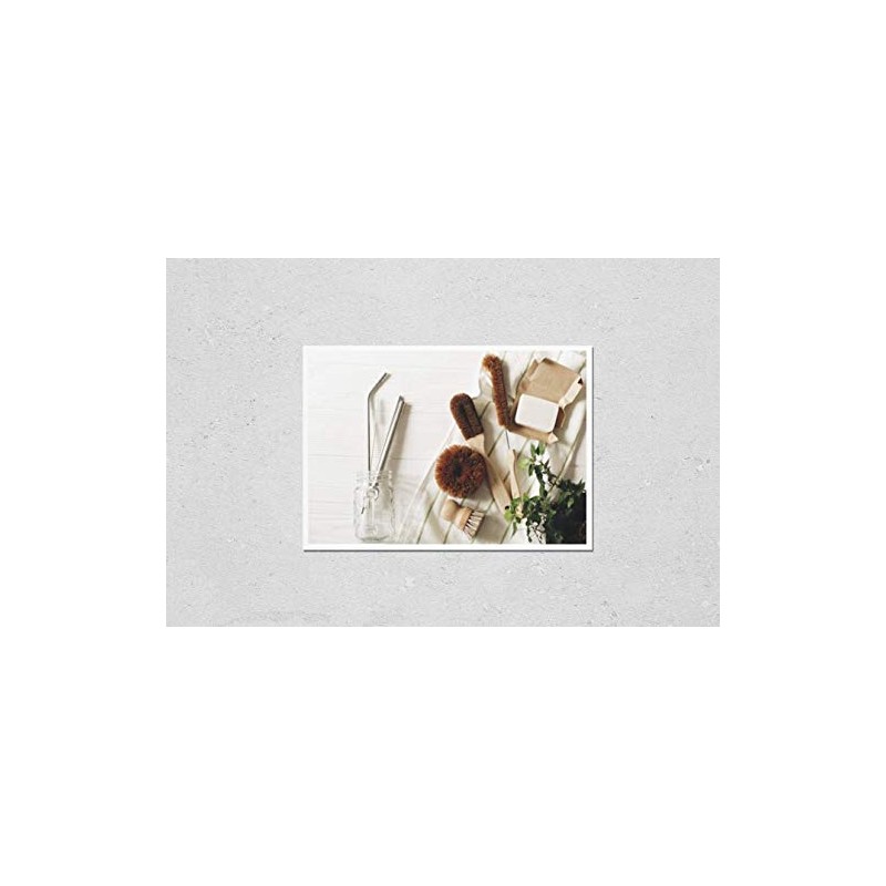 Poster Reproduction of eco natural coconut soap and brushes for washing dishes, metal straws, eco friendly flat lay. sustainable lifestyle concept. zero waste food cleaning. plastic free items