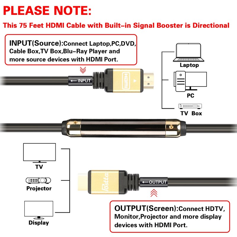 - PLEASE NOTE:This 75 Feet HDMI Cable with Built-in Signal Booster is Directional,If you Plan to Permanently install this Cables,Recommends that You Test and Connect the Cable before Installing.