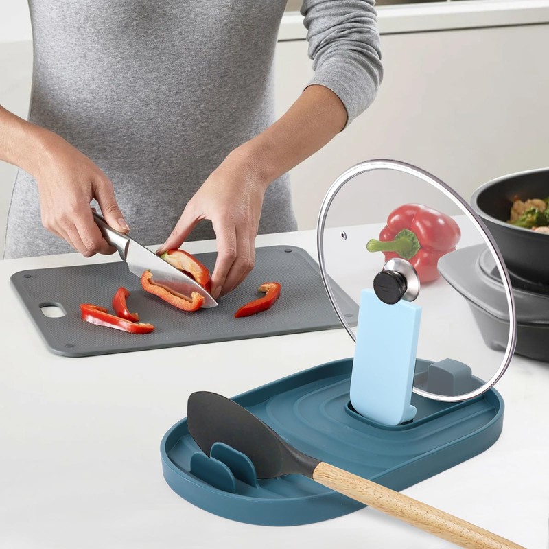 Pot Lid Holder Cooking Spoon Rest Multifunctional Kitchen Utensil Rest Spoon Holder Lid Holder Kitchen Pot Lid and Spoon Rest Drip Tray to Prevent Drip Stains, Plastic Blue