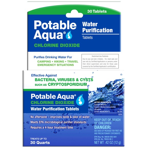 potable aqua Chlorine Dioxide Water Purification Tablets - 30 Count, Blue, (3093)