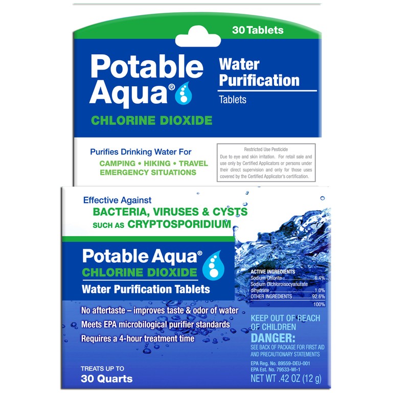Wherever life takes you, never be without clean drinking water when you have Potable Aqua Chlorine Dioxide Water Purification Tablets. These tablets are effective against viruses, bacteria and cysts such as Giardia lamblia and Cryptosporidium, and the water purification tablets for drinking water leave no aftertaste. Add these water treatment tablets to one quart (or one liter) of contaminated water, and allow four hours of treatment time for emergency water purification. The combination of active ingredients in these portable water treatment tablets react to create chlorine dioxide, a powerful disinfectant that meets EPA microbilogical purifier standards to make questionable water safe to drink in emergency water purification situations.