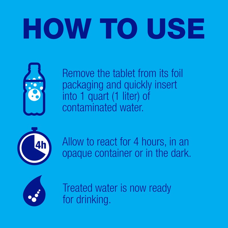 • Water treatment tablets, providing water purification for camping, hiking, traveling and emergency water preparedness situations, with no aftertaste