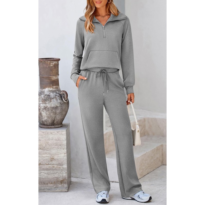Potany Women 2 Piece Half Zip Sweatsuit Fall Outfits 2024 Casual Sweatshirt Wide Leg Sweatpants Matching Lounge Set Tracksuit(Grey,XL)