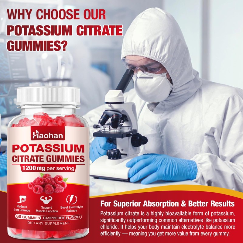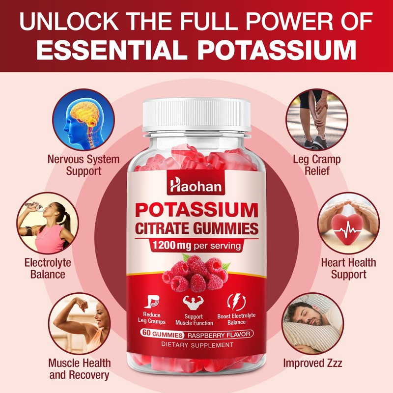Potassium Citrate 1200mg Gummies - Chewable Supplement to Support Muscle Health & Relieve Leg Cramps for Men & Women. Vegan, Gluten-Free, Sugar-Free, Raspberry Flavor, 120 Count