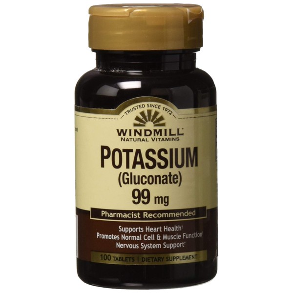 - windmill potassium as gluconate 99 mg tablets helps support nervous system and cardiovascular health. potassium gluconate helps regulate water balance within the body. it works to control the activity of the heart muscle nervous system and kidneys. helps control activity of the heart muscle.