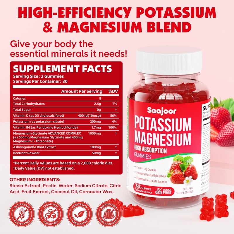 - High Potency Potassium Magnesium Gummies: Potassium Magnesium Gummies Contain Potassium Citrate 200 mg,Magnesium Glycinate 600 mg,Magnesium L-Threonate 400 mg,Ashwagandha,Vitamin D3,B6,Beetroot Powder. 2 Gummies Per Serving,60 Servings Per Bottle, for better protection and vitality!