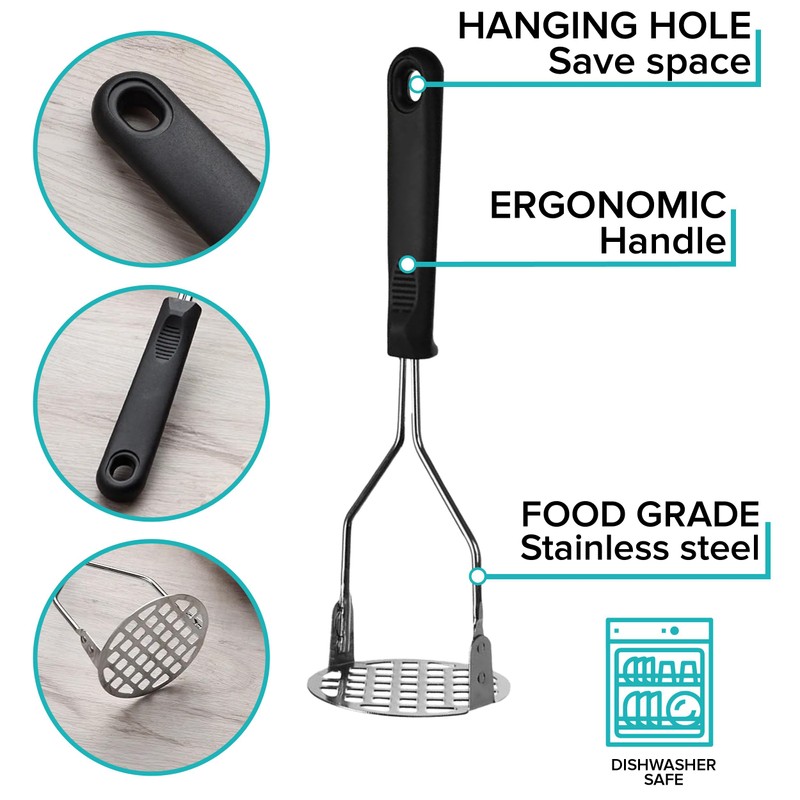 - This potato masher squeezes your hands while producing smooth, delicate pureed potatoes, dissimilar to customary potato mashers which accompany vertical holds, this creative potato masher is exceptionally helpful for use because of its wide level grasp which makes applying pressure-totally easy.