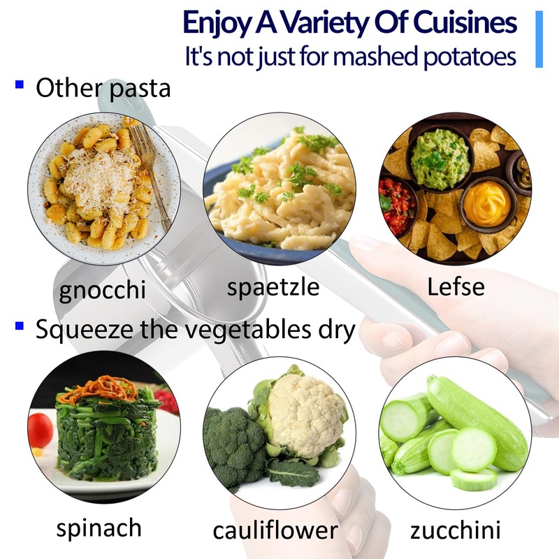 • đŸŒč【Enjoy A Variety Of Cuisines】The potato presser masher not only can make baby food and fruit juice,but also serves as a spaetzle press,passatelli maker, gnocchi maker,making delicious spaetzle,passatelli,gnocchi,lefse,etc.The best potato ricer is also suitable for draining vegetables such as spinach,cauliflower,zucchini,etc.SPEENSUN ricer for cauliflower is a great choice as a gift.