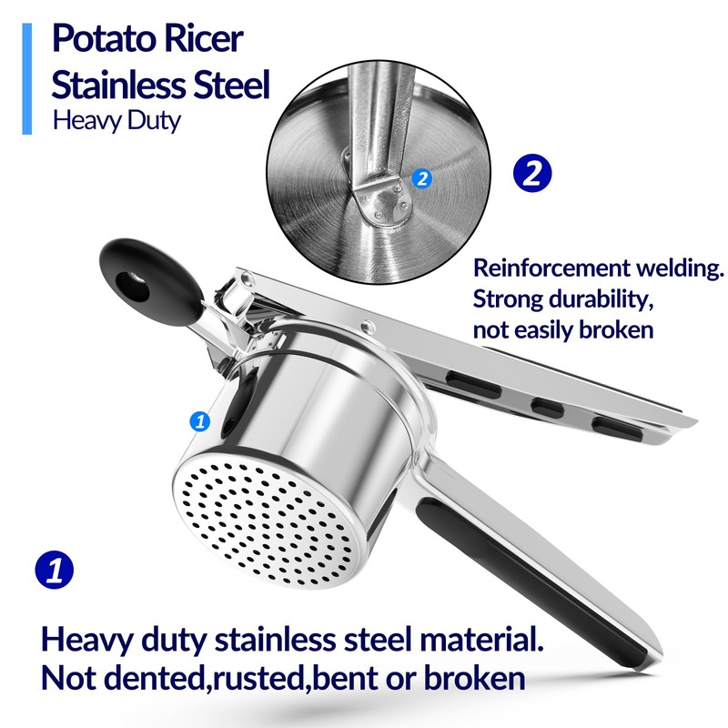 • đŸŒč【High-quality stainless steel material】The potato ricer is made of 100% stainless steel heavy materials.Potato ricer stainless steel have the ability to resistant stains,corrosion and deformation,it is very durable.Ricer kitchen tool is not dented,rusted,bentor broken,so they can be used multiple times.