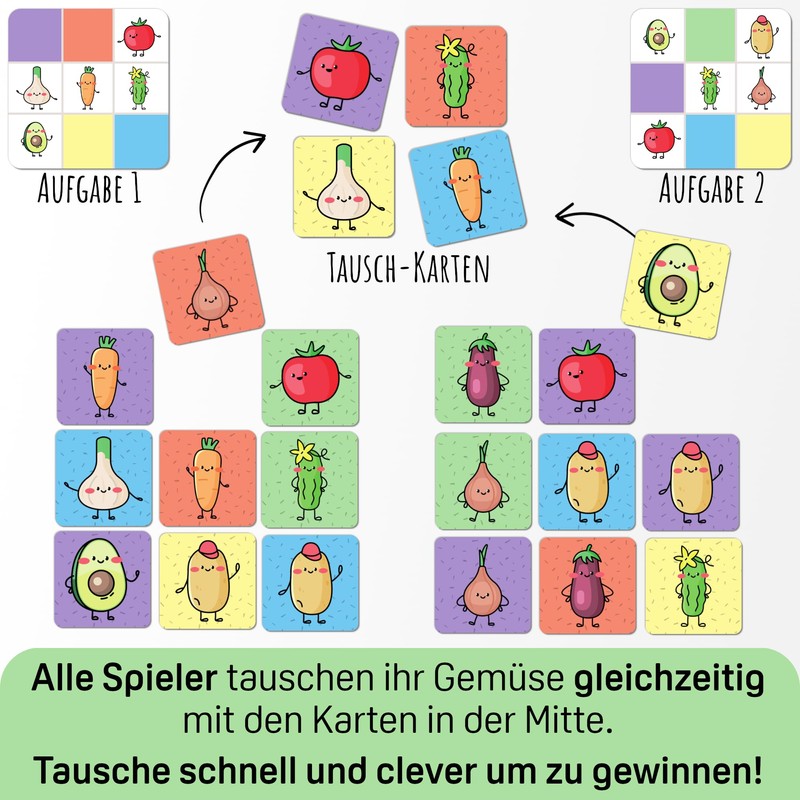 • Whoever has correctly added their pattern first, calls Potato Tomato! and has won the round, 2-4 players, from 6+ years, 10 minutes of playing time per game, game in German