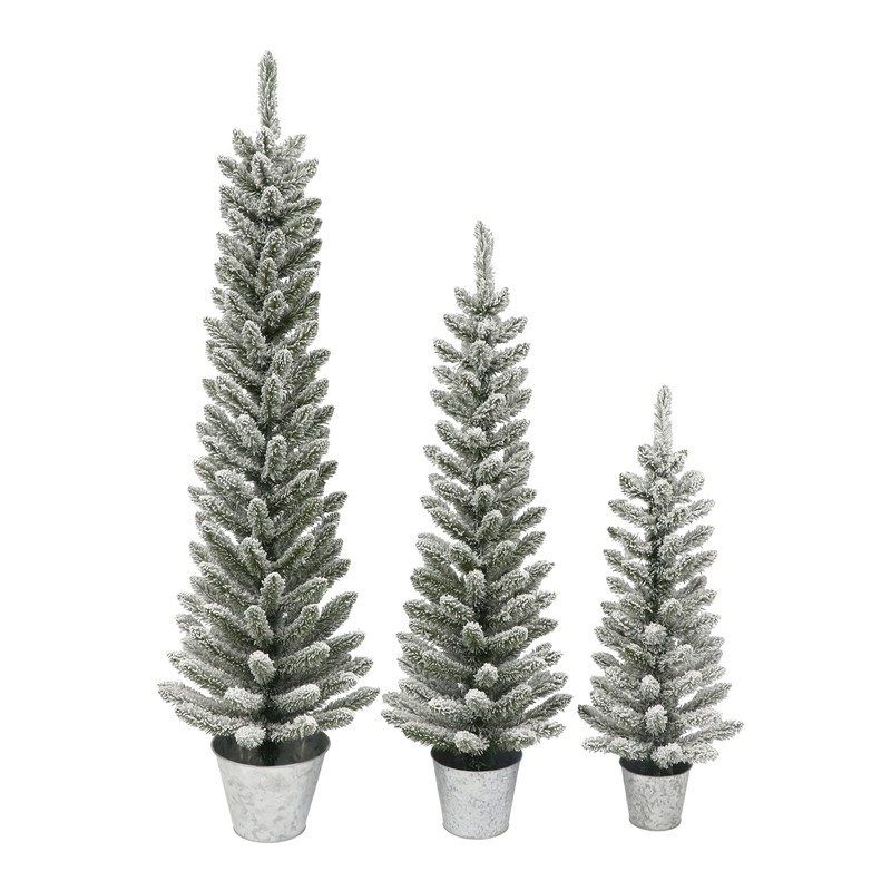 - SET OF 3 FLOCKED POTTED TREES: Set of 3 - 3ft, 4ft & 5ft - flocked potted pencil trees with galvanized metal pots