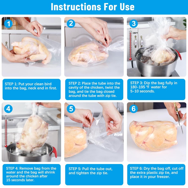 - Easy to Use: Put the whole chicken in the shrink bag (neck end in first), put silicone straw into the cavity of the chicken, soak the in 180-195 ℉ hot water for 5-10 seconds, fully shrinked and tie it with zip tie, then place it in the fridge