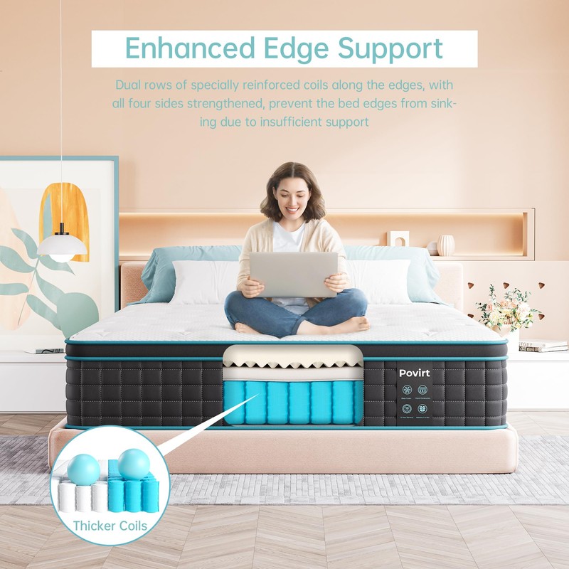 - đ„ăMotion Isolation & Edge SupportăThis full size 10 inch mattress features an independent pocketed spring system that minimizes disturbances when either you or your partner changes positions or gets up, ensuring an uninterrupted and peaceful sleep. The edge-enhanced support design not only enhances mattress stability for added sleeping comfort but also extends the mattress's lifespan.