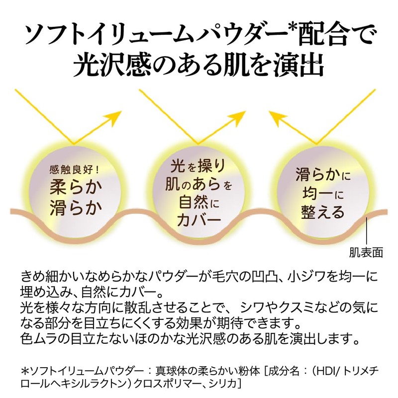 Creates a subtle glossy skin that is unobtrusive in color and is resistant to sweat and sebum and prevents makeup from shifting.