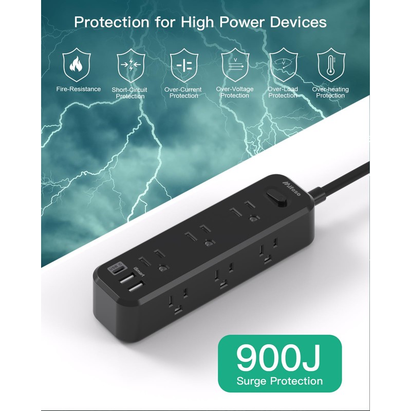 - Surge Protector:900j surge protection keeps everything running smoothly. Surge protector power strip provides multiple safety systems, including over-current,over-charge, short circuit, and over-heated. Protect your electronics from overload, short circuits, and voltage fluctuations.