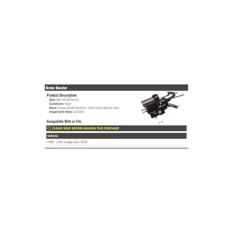- Compatible with or fits: 1998 - 2002 Dodge Ram 3500 - with Hydro-Boost Type Only