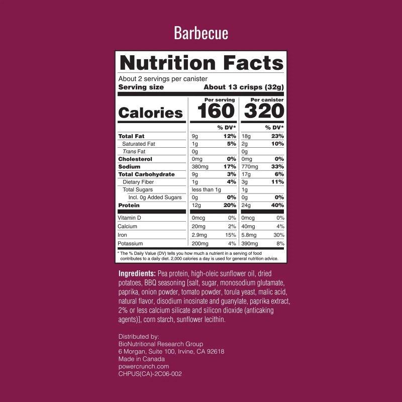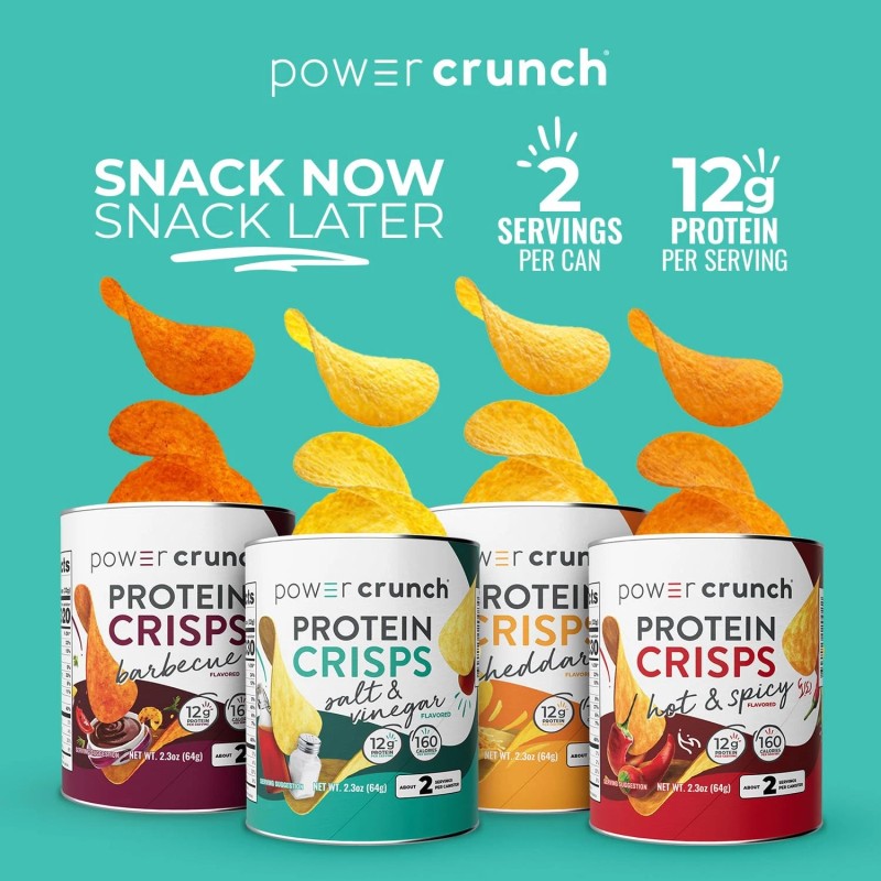 - PERFECT POTATO CHIP ALTERNATIVE: The Power Crunch BBQ Protein Crisps provide all the crunch and satisfying taste of a regular chip but packed with protein. With 12 grams of protein per serving (2 servings per can), you can feel good about eating Power Crunch CRISPs.