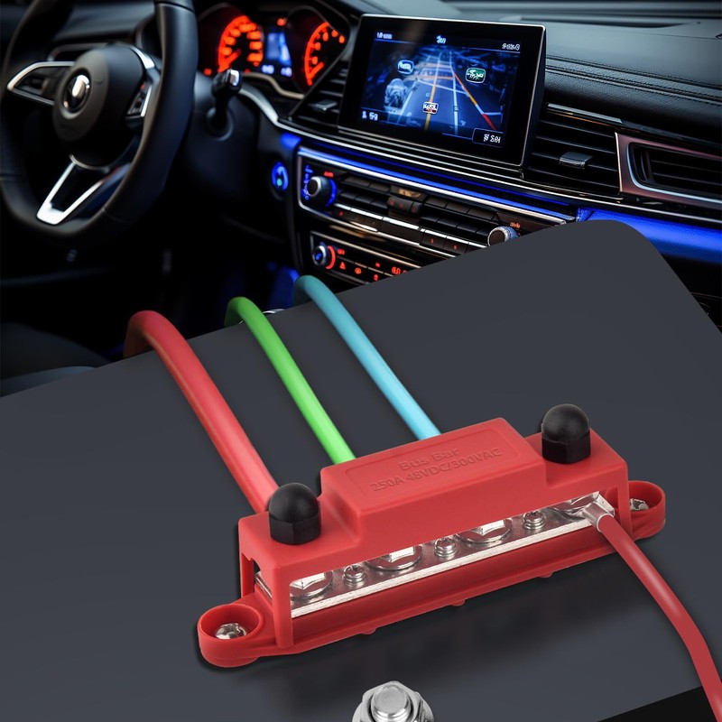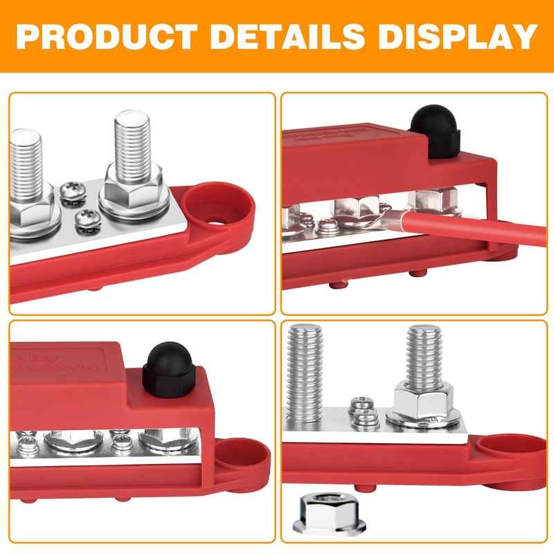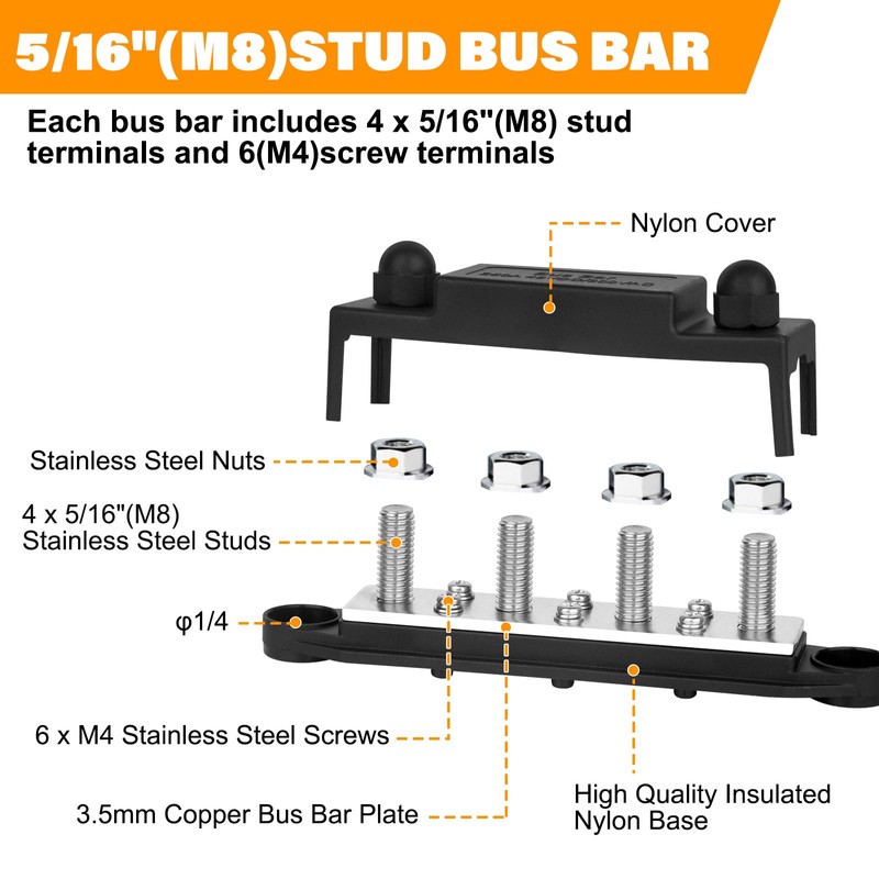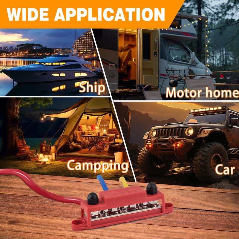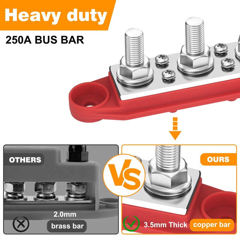 - A pair of 12V power distribution block, includes a red and a black power distribution block(Positive&Negative). It comes with 3.8MM Thicker Copper Bus Bar Plate which can be connected to wider range of cables.