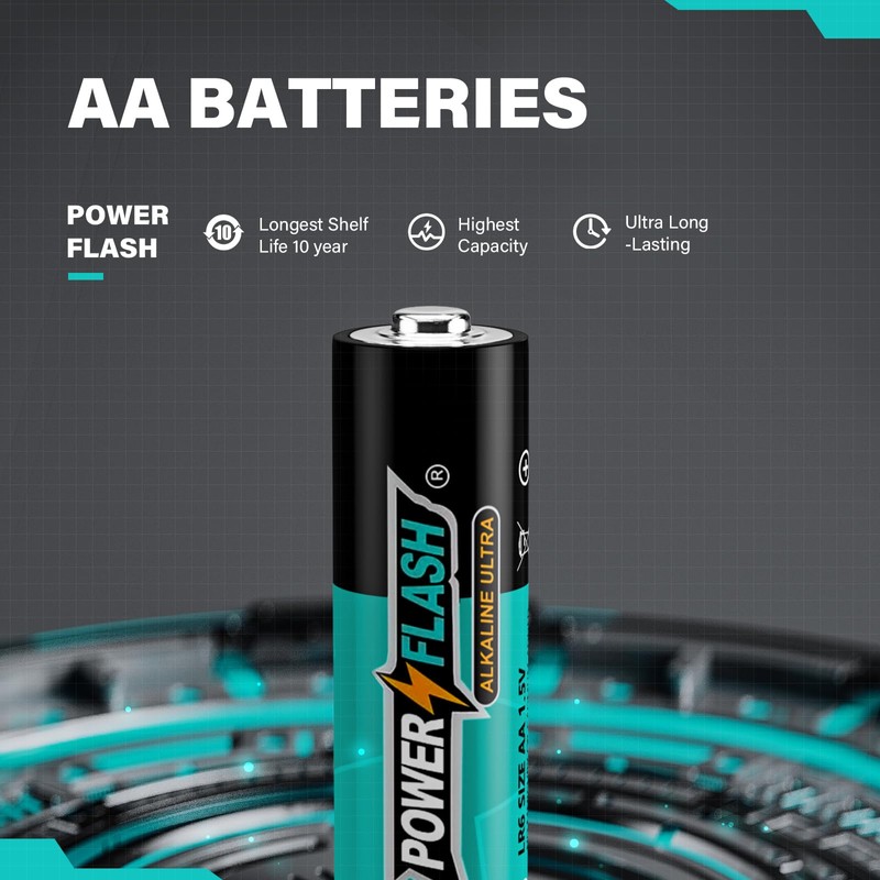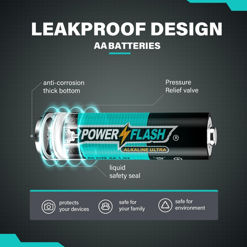 - LEAKPROOF DESIGN - PowerFlash AA batteries are designed to seal in materials and protect your electronic devices. This means batteries are perfect for daily household or business use, and perfect for your family’s needs.