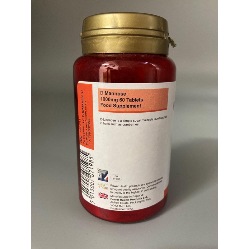 Pure D-Mannose from trusted UK manufacturer Power Health who have been making vitamins and Supplements for over 50 years. 1000mg strong and easy to break if you prefer a smaller tablet. A natural simple sugar found in Cranberries.