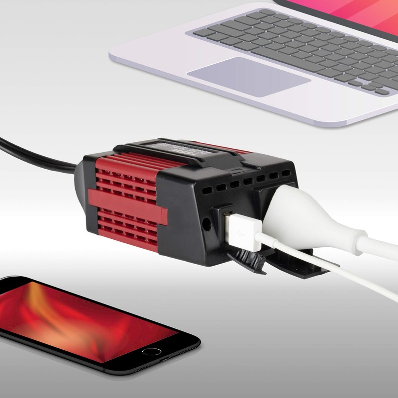 - Harness your vehicle's battery to efficiently power office equipment on the road