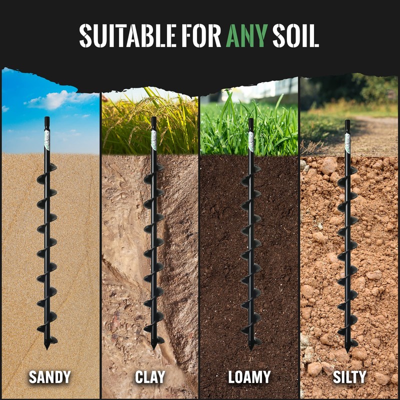 - NO GROUND TOO TOUGH: Our patent-pending design makes these post hole digging augers effective against any type of soil - hard dirt, clay, rocky soil, and sand. Drill your garden or post holes, and even use it as an auger for beach umbrella poles. This plant auger rotates and tackles digging jobs without vibrations.