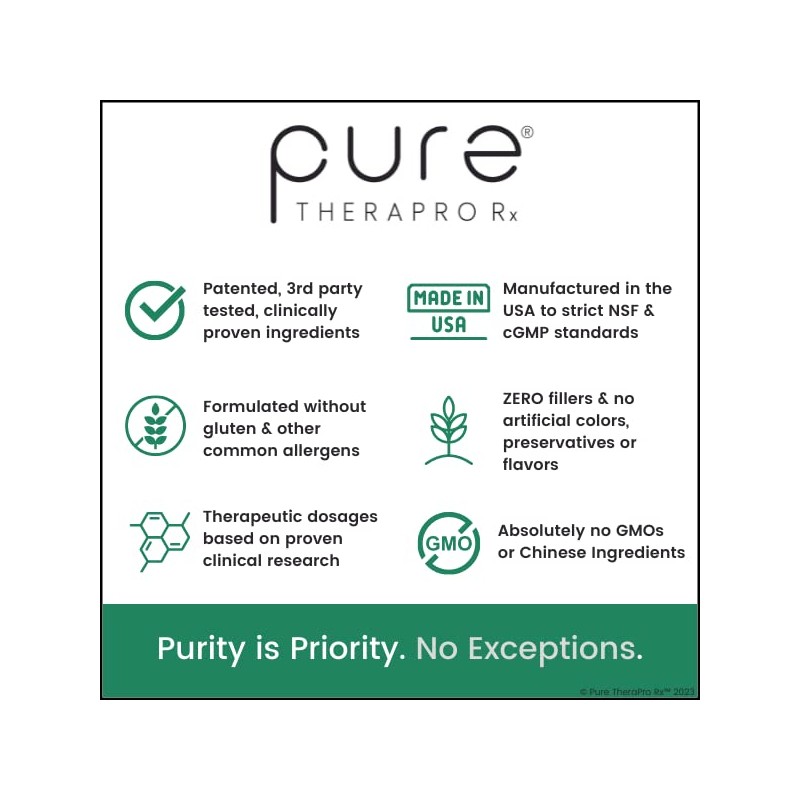 - ABOUT US: Pure TheraPro Rx was founded in Denver Colorado to formulate and manufacture the highest quality supplements available on the market today. Purity is our priority, which is why we insist on using patented, clinically studied ingredients, and never utilizing fillers, flow agents, excipients, or ingredients sourced from China. We also never use dairy, gluten, corn, soy, or other common allergens in any of our class-leading, practitioner-recommended formulas.