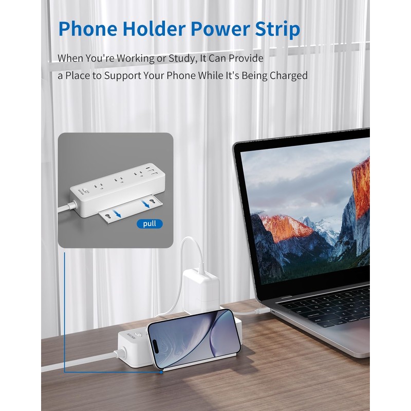 - 【9 IN 1 Flat Plug Power Strip】 6 Outlet Extension Cord with 2 USB-A, 1 USB-C Slots especially for plugging in kitchen appliance, home appliance, 3C device etc (such as microwave, washing machine, laptop, desk computer, phone...).