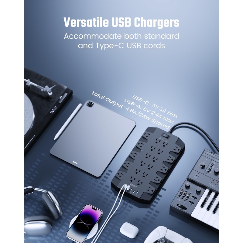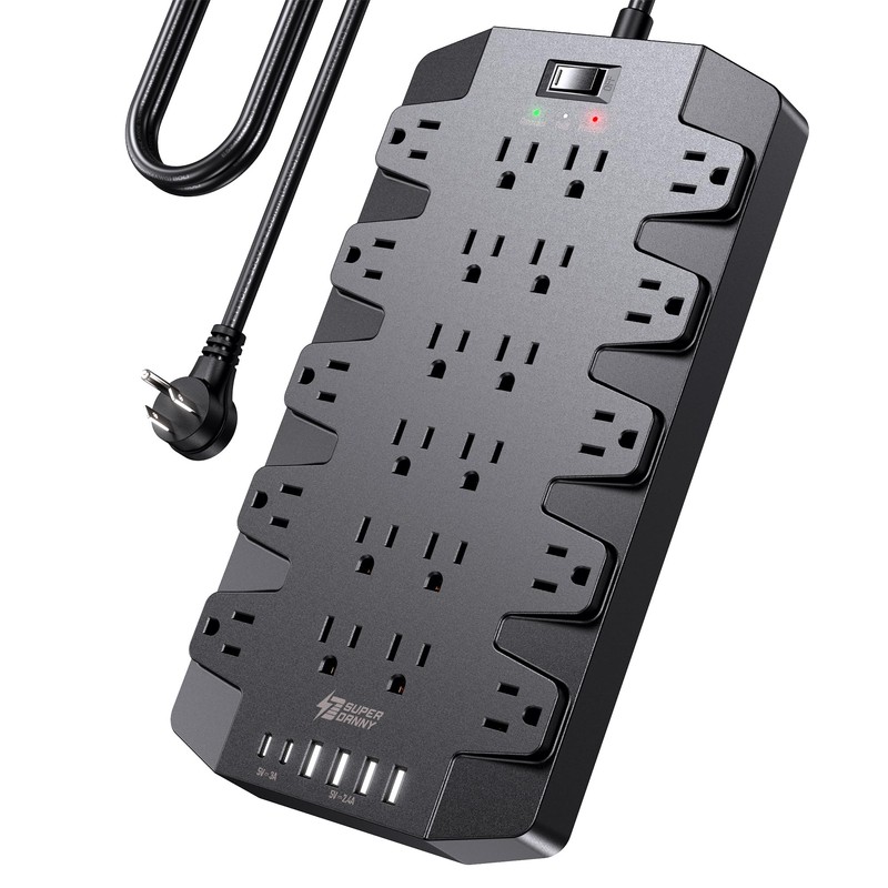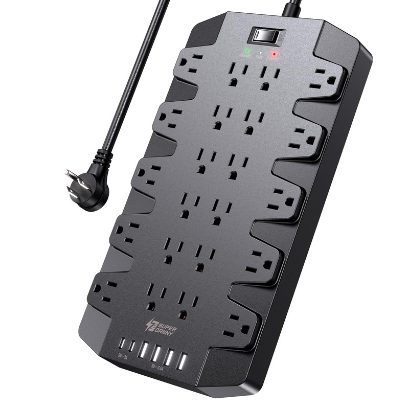 - 【Ultimate 28-in-1 PowerCarrier】With 22 grounded 3-prong outlets and 6 USB ports (2 USB-C + 4 USB-A), SUPERDANNY 2023 NEWEST large power strip accommodates all the power devices in one place. Only one charging station is enough for all your gaming setup, media essentials, phone, tablet, PC, laptop, computers, headphones, sound system, TV, router, monitor, camera, smartwatch, microphone, printer, fax machine, scanner, fan, etc. Have a clutter-free gaming corner or home office now.