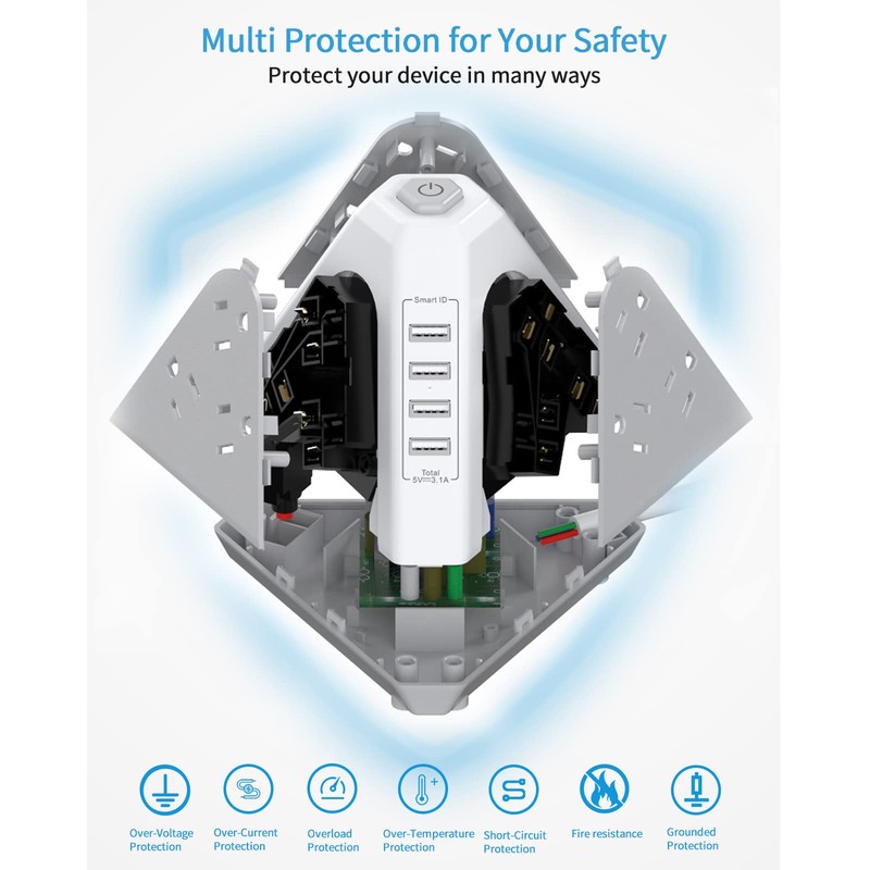 2. The usb power strip surge protector with multiple protection is made from ABS + PC fire-resistant material and advanced multifunctional protection technology, protector your devices from over-current/over-voltage/over-load/over-heating/short-circuit/high-temperature, very safe to use.