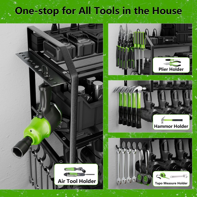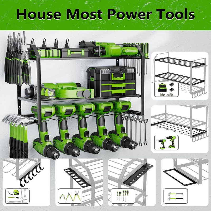 • 3 Layer 5 Slots Drill Modular Tool Organizer: This wall mounted tool rack features 3 layers of high-capacity storage, designed to hold various essential tools. The top layer is ideal for batteries, chargers, and tall cans, the middle layer can hold toolboxes and portable power tools, and the bottom layer can hang up to 5 drills.