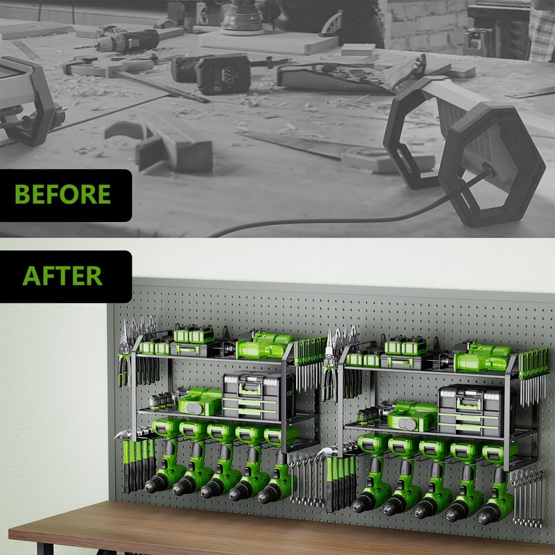 • Store 25+ Kinds of Tools: Our cordless drill holder is suitable for both indoor and outdoor use and compatible with pegboards. You can store your charging stations, batteries, toolboxes, drill bits, hammers, and other garage tools without any extra hassle.