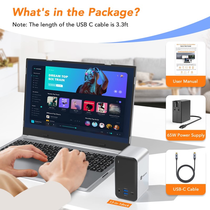 • What's in the Box: The inside of the USB C dual monitor docking station's package includes the 13-in-1 USB C Docking Station, USB-C cable, and 65W power adapter