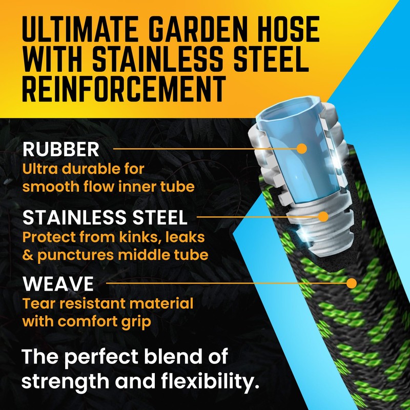 - Durable Construction: The POWERFLOW Garden Hose is NON-EXPANDABLE and crafted with a robust stainless steel metal core, ensuring exceptional durability for both commercial and residential use. The ultra-durable fabric skin adds an extra layer of protection, making it resistant to kinks, twists, and punctures for long-lasting performance.