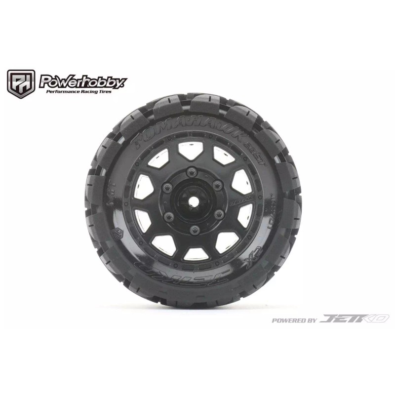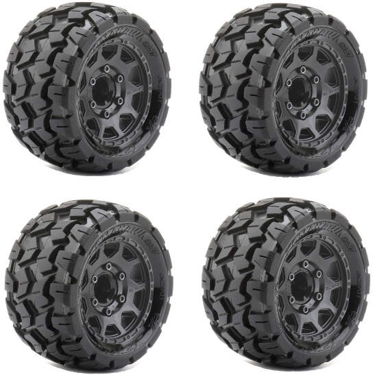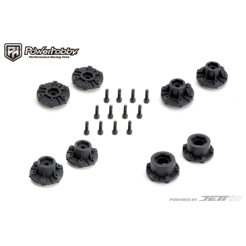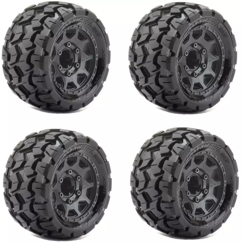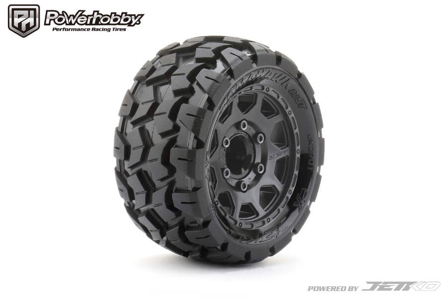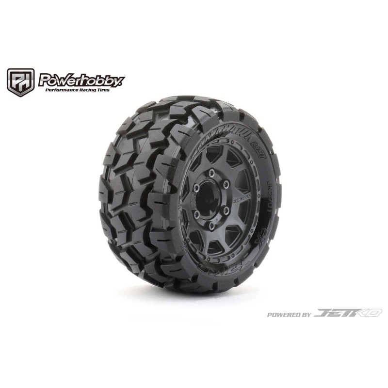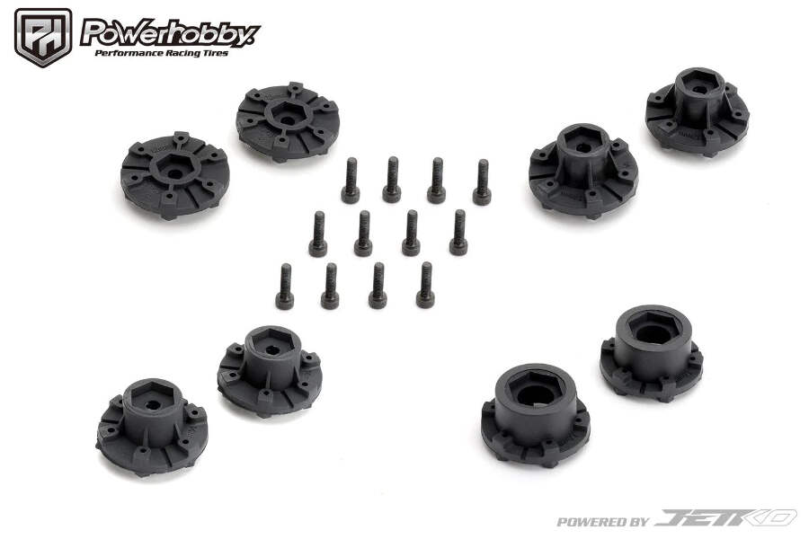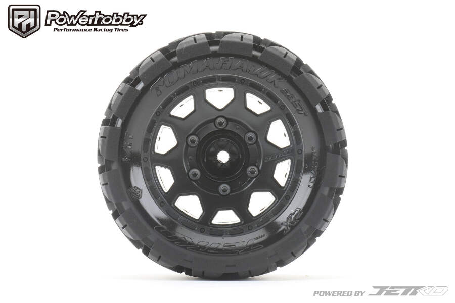 Powerhobby 1/10 2.8 ST Tomahawk Belted Tires (2) with Removable Hex Wheels Powered by JetkoIncludes all 4 adaptersFeatures: USA Rubber Loctite Glue Pre-Mounted on the next generation 2.8" wheels w Removable Hex Medium Soft Compound Black Claw Rims Includes:(4) Mounted Tires(4) 12mm 0" Offset Narrow(4) 12mm 1/2" Offset Wide(4) 14mm for Arrma(4) 17mm For Pro-line and othersFits but not limited too:12mm 0 offset Narrow ( FOR Traxxas Stampede / Ruster 2wd / 4wd - Front or Rear )12mm 1/2 offset wide ( FOR Traxxas Stampede / Ruster 2wd / 4wd - Front or Rear14mm ( FOR Arrma Granite / Senton )17mm Proline and othersSpecs: Width: 57mm Height : 114mm Wheel Diameter : 69mm Hex : 12 / 14 / 17mm Weight : 5.96 ounces (each)Powerhobby 1/10 2.8 ST Tomahawk Belted Tires (4) Traxxas Jato