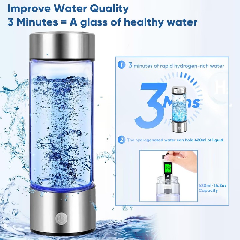 - Portable Hydrogen Bottle: The hydrogen water bottle holds up to 420ml (about 14 ounces) of liquid. Made from food-grade borosilicate glass, it is free from harmful substances, ensuring safer consumption. Its portability makes it convenient for ensuring your daily hydration needs during exercise, outings and work, enjoy hydrogen-rich water on the go