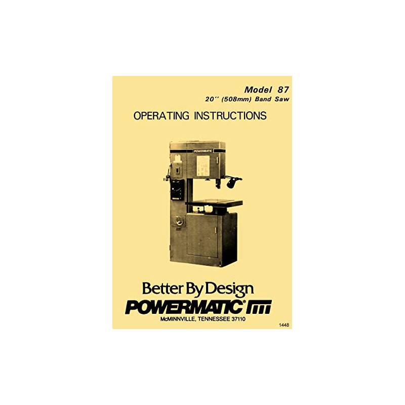 Number of Pages: 18 This is a reproduction, not a photocopy, of an original Powermatic Model 87 Band Saw Operating Instructions Manual. This manual contains information on the band saw specifications, safety rules, check list for different sawing operations, information on blade selection, and optional accessories available for this band saw. It also includes a trouble-shooting guide to help you get the best cut on this Powermatic 87 band saw. We have the maintenance instructions and parts manual for this Powermatic 87 band saw here: POWERMATIC 87 20″ Band Saw Maintenance Instruction & Part Manual Overview: I have collected this information for many years and have found the information they contain to be priceless in using and setting up the machines properly. I believe this manual will be a valuable resource of knowledge that will provide a lot of helpful information that is often hard to find. My manuals are not photocopies. I maintain a high standard of quality in my reproductions. Most of the manuals I reproduce look better than their originals. I have professionally digitally edited every page, and removed stains, wrinkles and handwriting. All of the manuals are printed on thick white paper to withstand shop wear and tear.